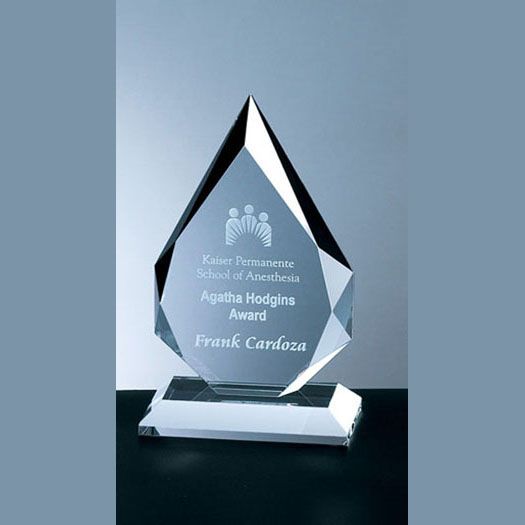 This optical crystal prestige flame award has a flat polished face with a faceted edge. There is plenty of room to engrave your text and logo on this crystal award.