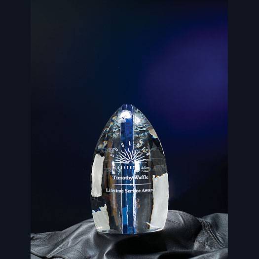 Part of the Nik Meller collection,this optical crystal solitude award is among the finest we have carried. It has a curved front and a wedged back with a blue crystal spine. It has plentyof room to engrave your text and/or logo onto this crystal award.